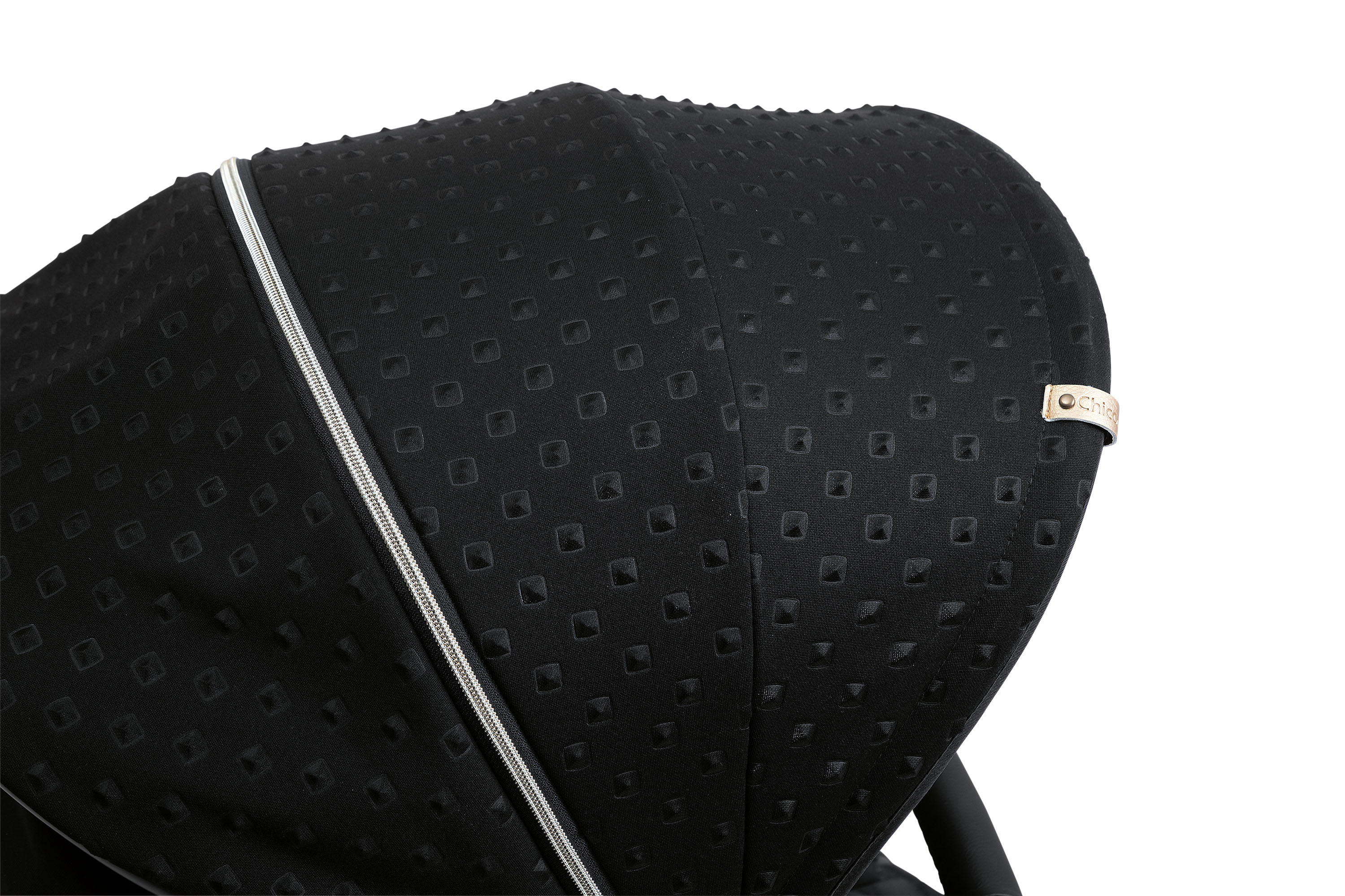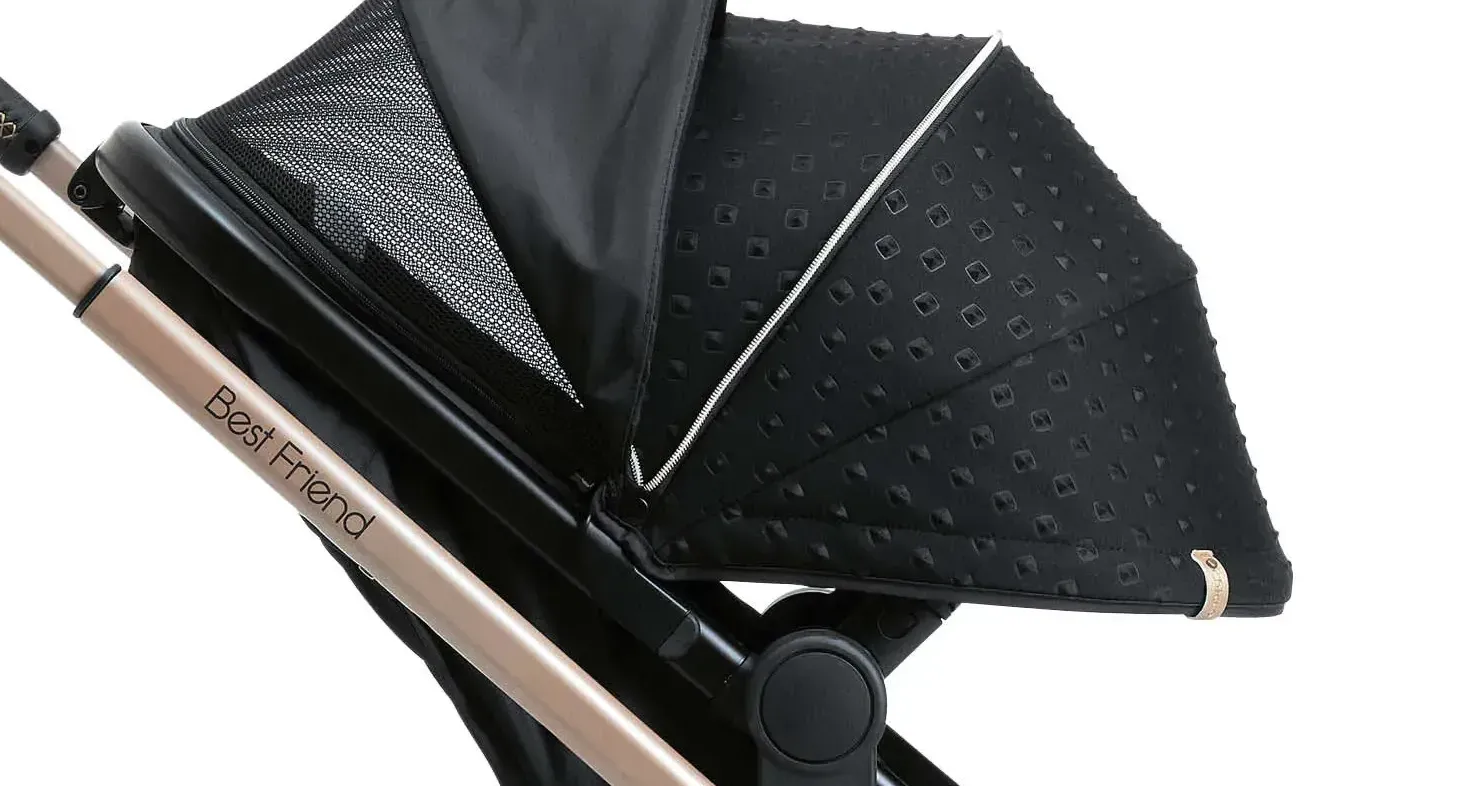 Extended canopy with a zipped hidden segment and a net mesh peek-a-boo window. The fabric is water-repellent and has UV50 + sun protection.