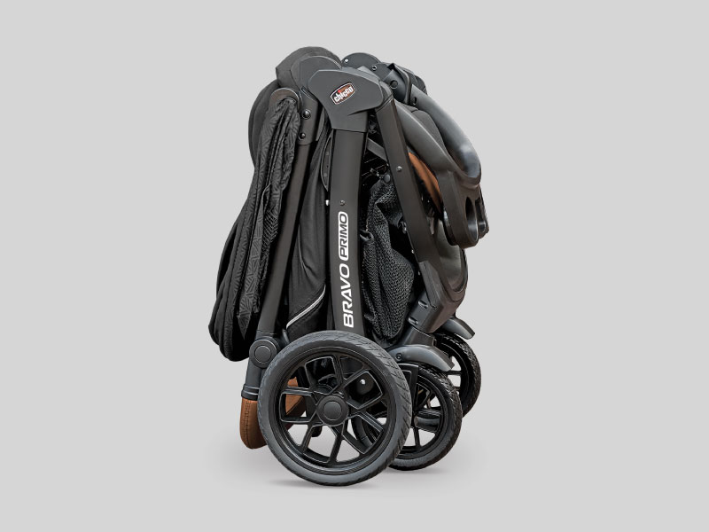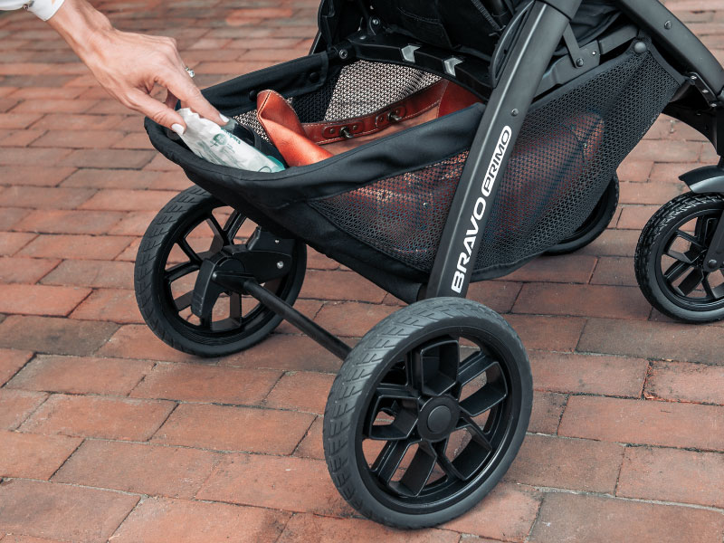 For additional parent convenience, the Bravo® Primo folds compactly with the child tray and stands independently without the push handle touching the ground. The large storage basket features 2 organizer pockets, mesh sides for visibility and easy front & rear access.