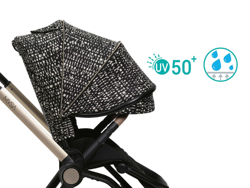 The hood of the Mysa stroller has an XL extension and a comfortable window to always have your child within sight. Thanks to the UV50+ and rainproof treatments, your child is completely protected and sheltered from the sun’s rays.