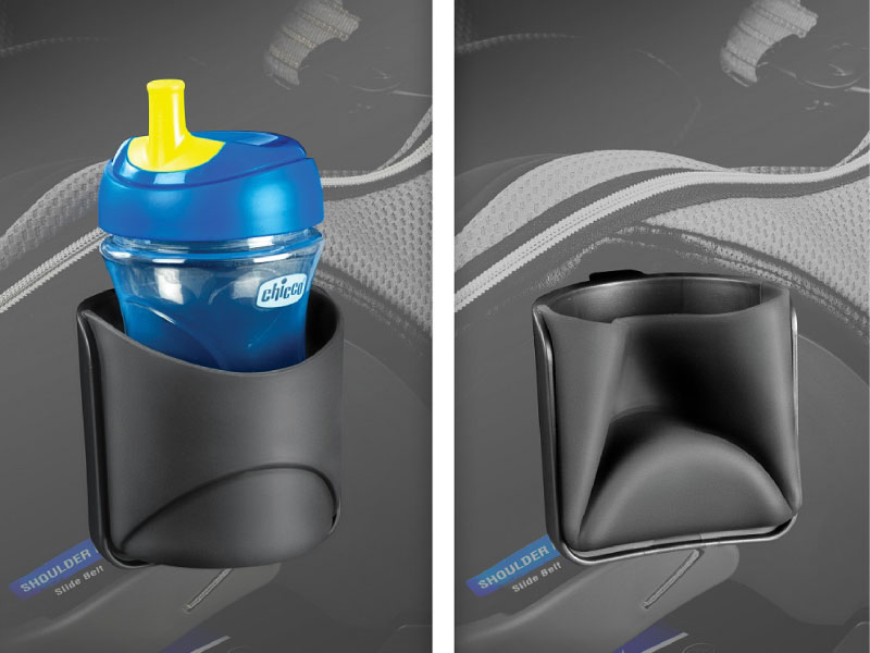 Dishwasher-safe cup holder folds inward to save space when not in use.