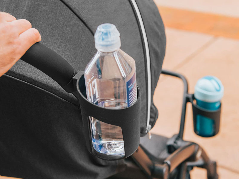 - Padded leatherette handle and two interchangeable cup holders for parent and child use