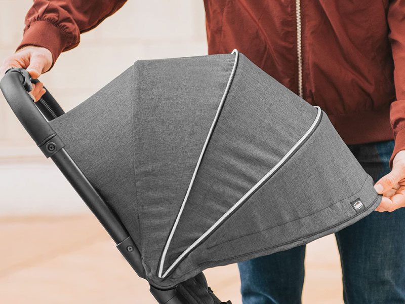 UPF 50+ rated, adjustable canopy offers shade and privacy while on the go.