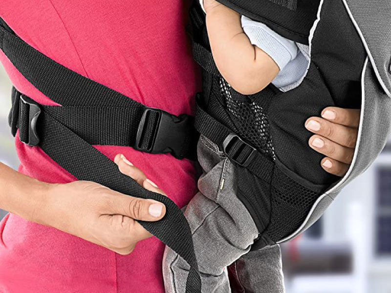 • Padded shoulder straps and bi-directional side straps adjust for mom/dad